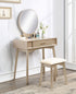• Dimensions and Details: Vanity dimensions: 32.28"W x 16.54"D x 52.75"H. Mirror diameter: 19.7". Table top: 31.5"W x 15.75"D. Drawer width: 20.57". Stool dimensions: 16.54"W x 12.6"D x 17.52"H.