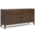 • Features three (3 )central drawers with metal glides, and two (2) sidedoors that open to large storage spaces with one (1) adjustable shelf each.