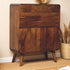 • Cabinet Curved Nordic Charm Artisan Furniture - Crafted from 100% Solid Mango Wood, this storage cabinet combines functionality with mid-century modern aesthetics. The warm Chestnut finish highlights the natural grain of the wood, adding timeless appeal. Featuring two compact drawers and a dual-door cabinet with two slots, it provides versatile storage for your essentials. Its clean lines, curved edges, brass knobs, and Nordic-style legs enhance its minimalist charm, making it perfect for bedrooms, living rooms, or home offices. This piece offers a stylish and durable solution for organizing your space with understated elegance.
