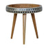 • Small Patterned Nordic Style End Table - This solid wood end table has made from 100% mango wood in a fine finish. The no-fuss finish reveals the beautiful grain of the mango wood which this piece of furniture is made of. This tripod table stands on Nordic style legs and features a and white bone inlay pattern on the edges. The bone is sourced responsibly from deceased animals such as camels, goats, and buffaloes.