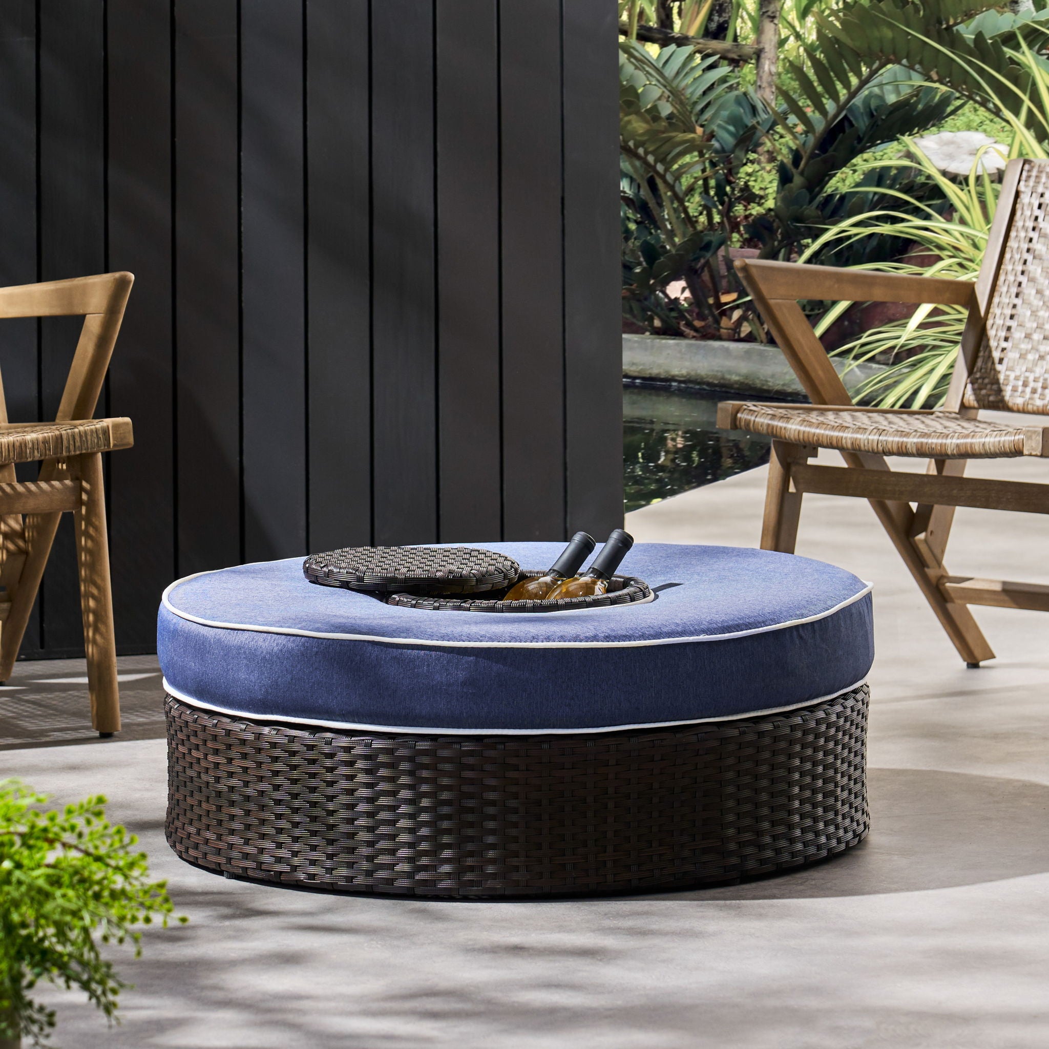 Modern Madras Ottoman With Ice Bucket Rattan, Iron, Waterproof Fabric - Brown