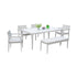 • Two-Tone Elegance: Sleek rectangular matte white tabletop paired with grayish frame, complemented by matching gray-framed chairs with white canvas cushions.