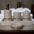 • Brass Inlay Bathroom Set of 5 - This 5-piece round bathroom set is made from white marble adorned with a brass band. Consists of a soap dish, soap dispenser, toothbrush holder, cosmetic box holder, and tray. A beautiful set of accessories for your bath as well as making a unique gift choice.