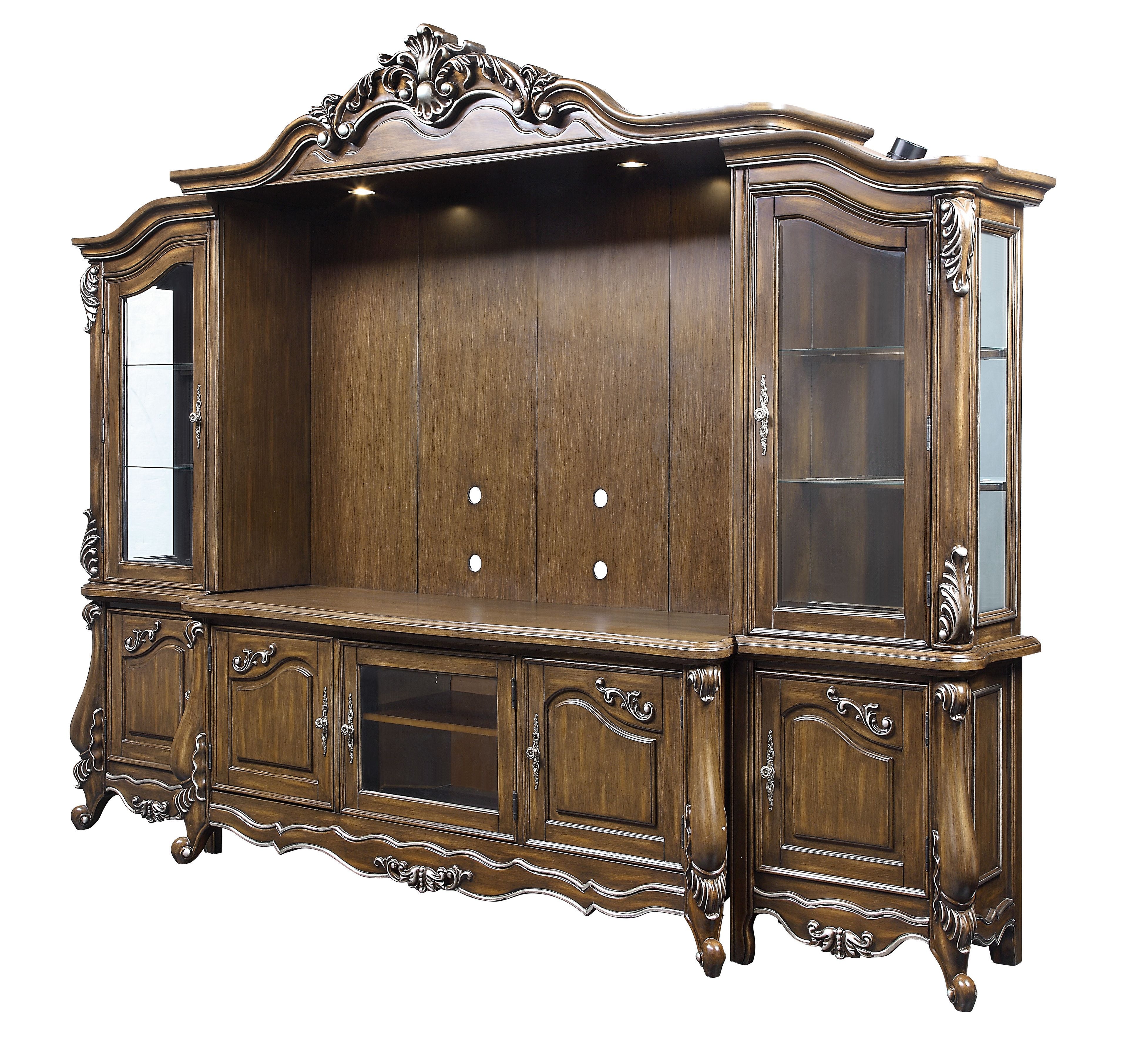 • Elegant Design: The Latisha Antique Oak Finish Entertainment Center features a stunning floral trim and includes touch lighting, enhancing its sophisticated aesthetic. This piece is crafted to complement any living room setup with its elegant design elements.