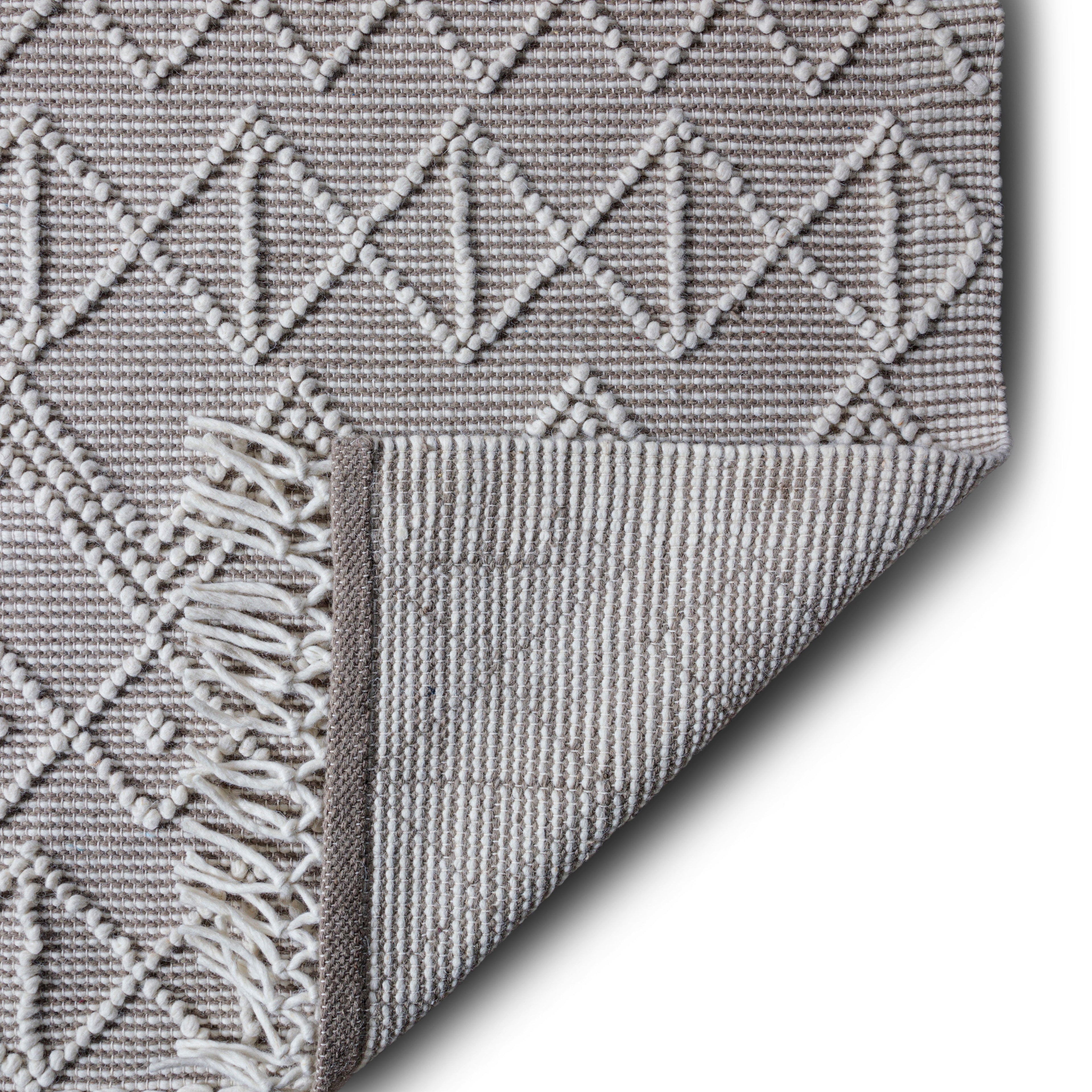 • Detailed with a geometric pattern in ivory and taupe featuring a hand-knotted fringe