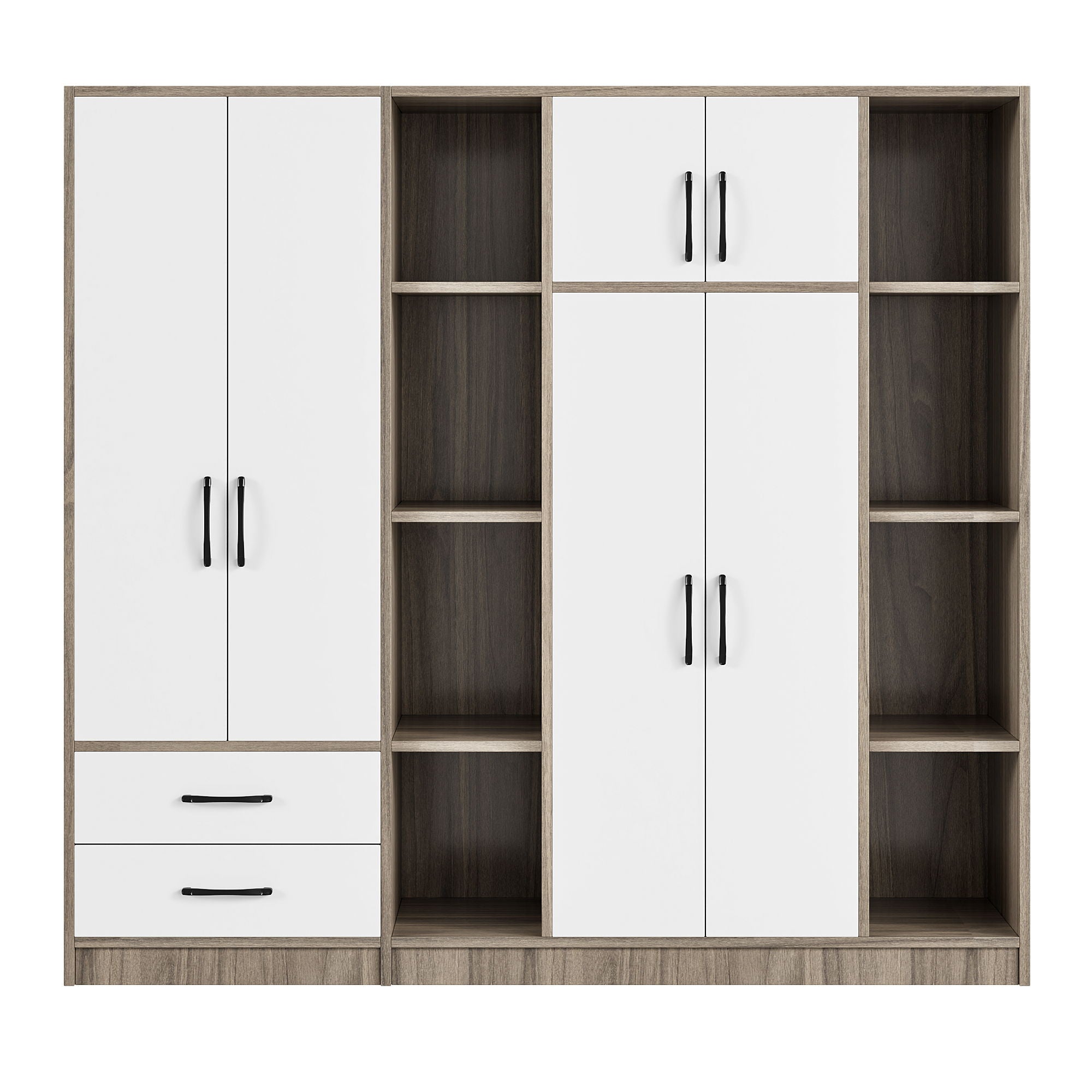 This 6-door bedroom wardrobe, shelves, drawers and hanging rods is ideal for bedrooms with a modern decor theme. It features two dust-proof wardrobe sections with hanging rods, two pull-out drawers for easy access, a closed storage cabinet for your items, and eight open shelves for additional organization. This wardrobe maximizes your storage needs while keeping your space tidy and accessible. This 6-door wooden wardrobe combines style and functionality, offering ample storage for your clothing and accessories.