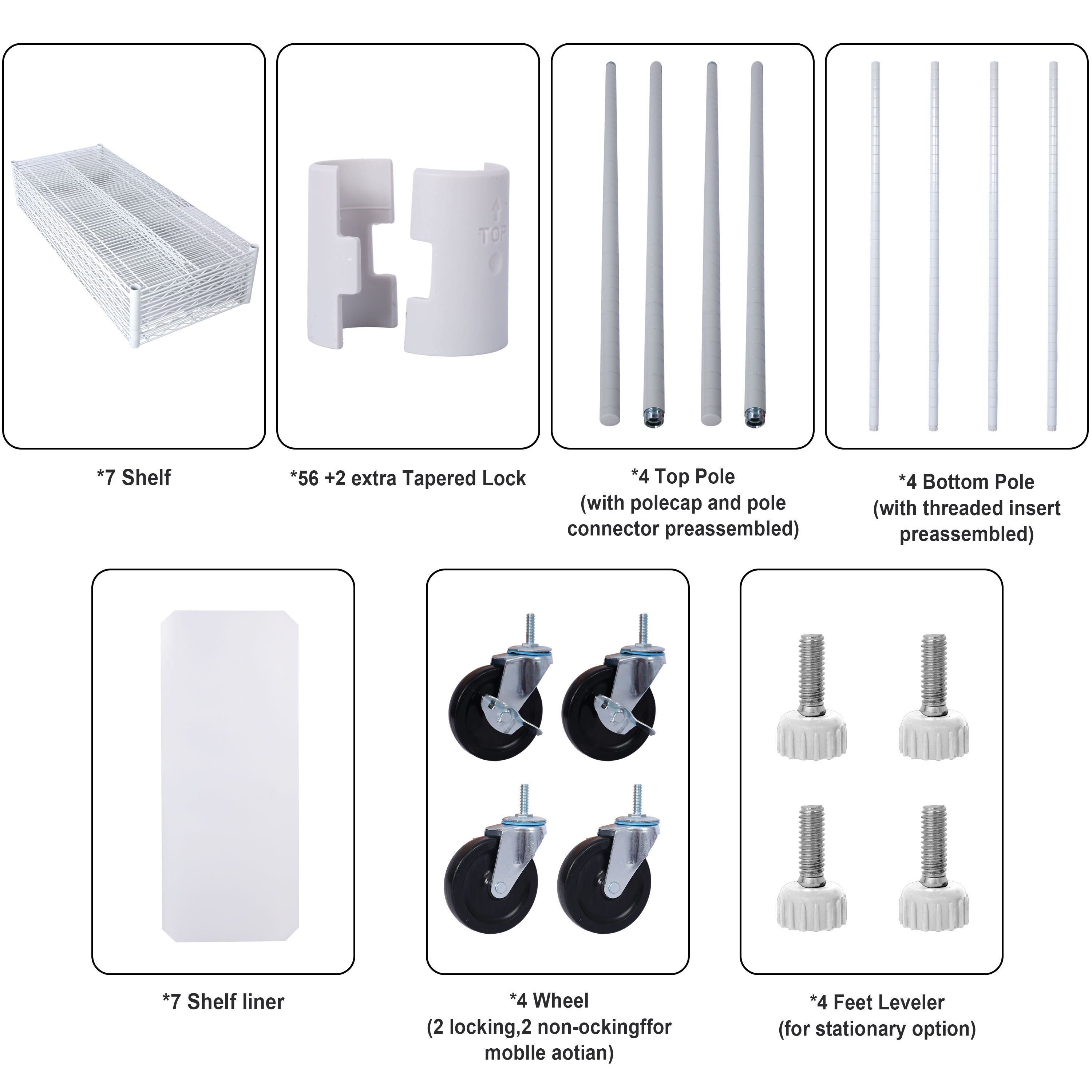7 Tier Metal Shelf Wire Shelving Unit, 2450Lbs Heavy Duty Adjustable Storage Rack With Wheels & Shelf Liners For Closet Kitchen Garage Basement Commercial Shelving - White