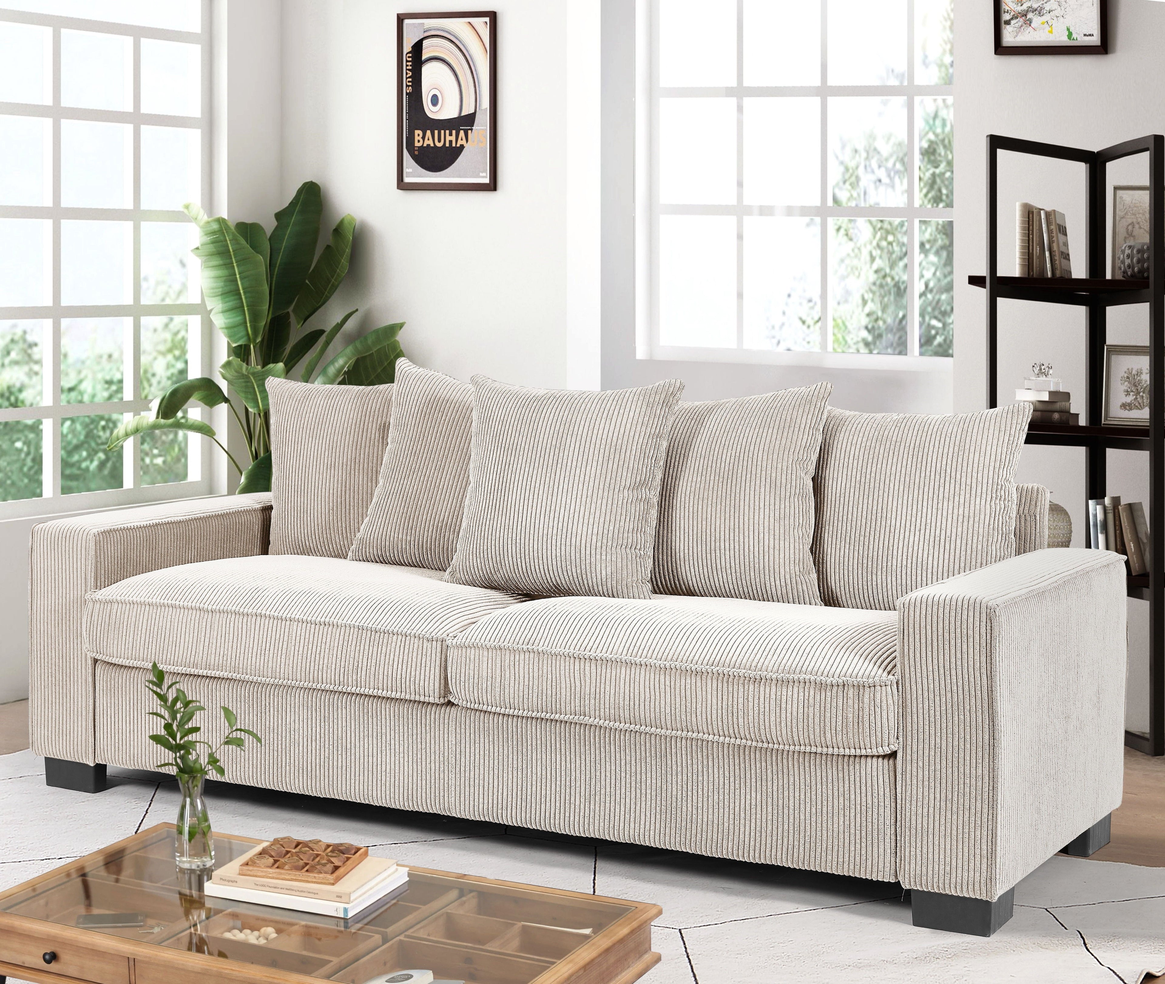 Luxe Corduroy Sofa With 5 Matching Toss Pillows, Sleek Design, Spacious And Comfortable 3 Seater Couch - Ivory