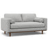 • Sturdy, corner-blocked frame made with solid and engineered woods includes high-quality, high-resilience webbing on the back to provide support; webbing and high-gauge sinuous springs under the seat to prevent sagging; and solid wood legs and plinth in a brown finish.