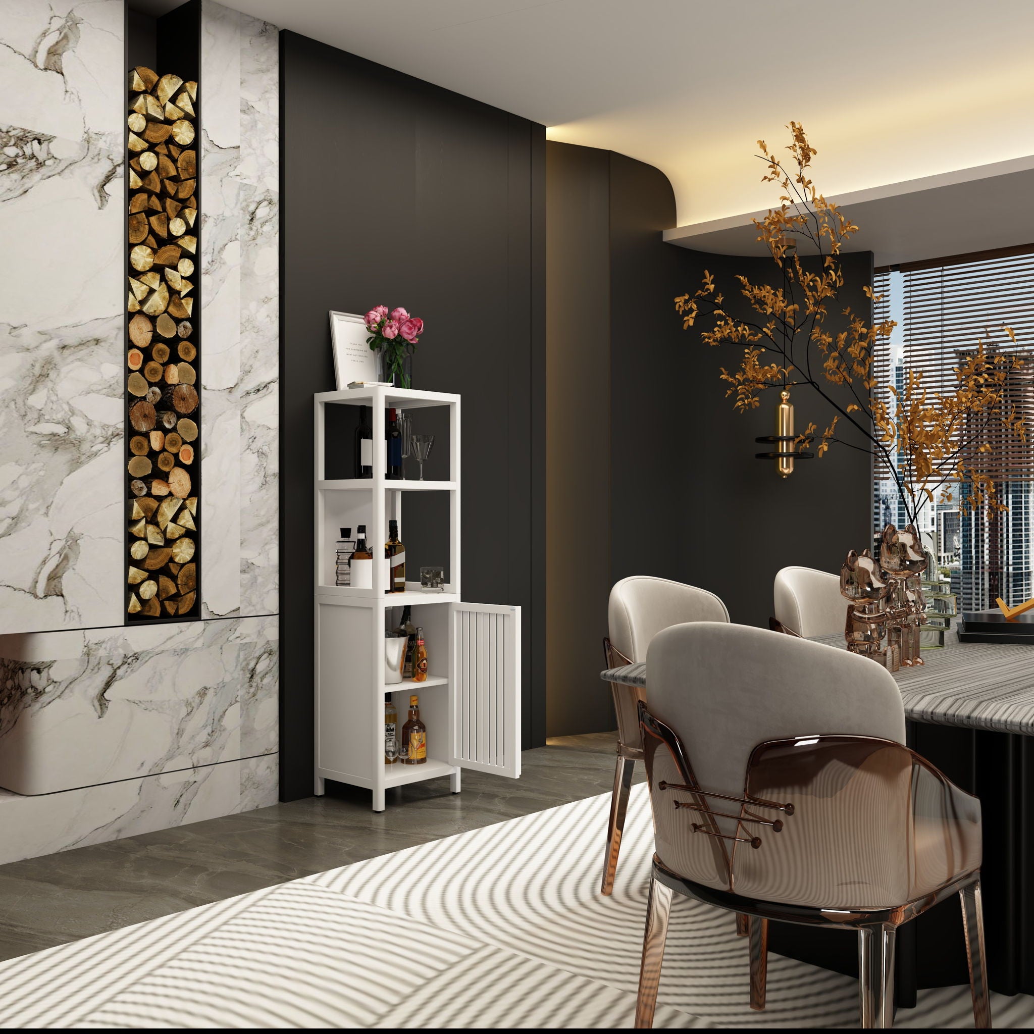 • Practical Storage Space: Maximize your space with 2 open shelves and a cabinet with doors, perfect for small corners.