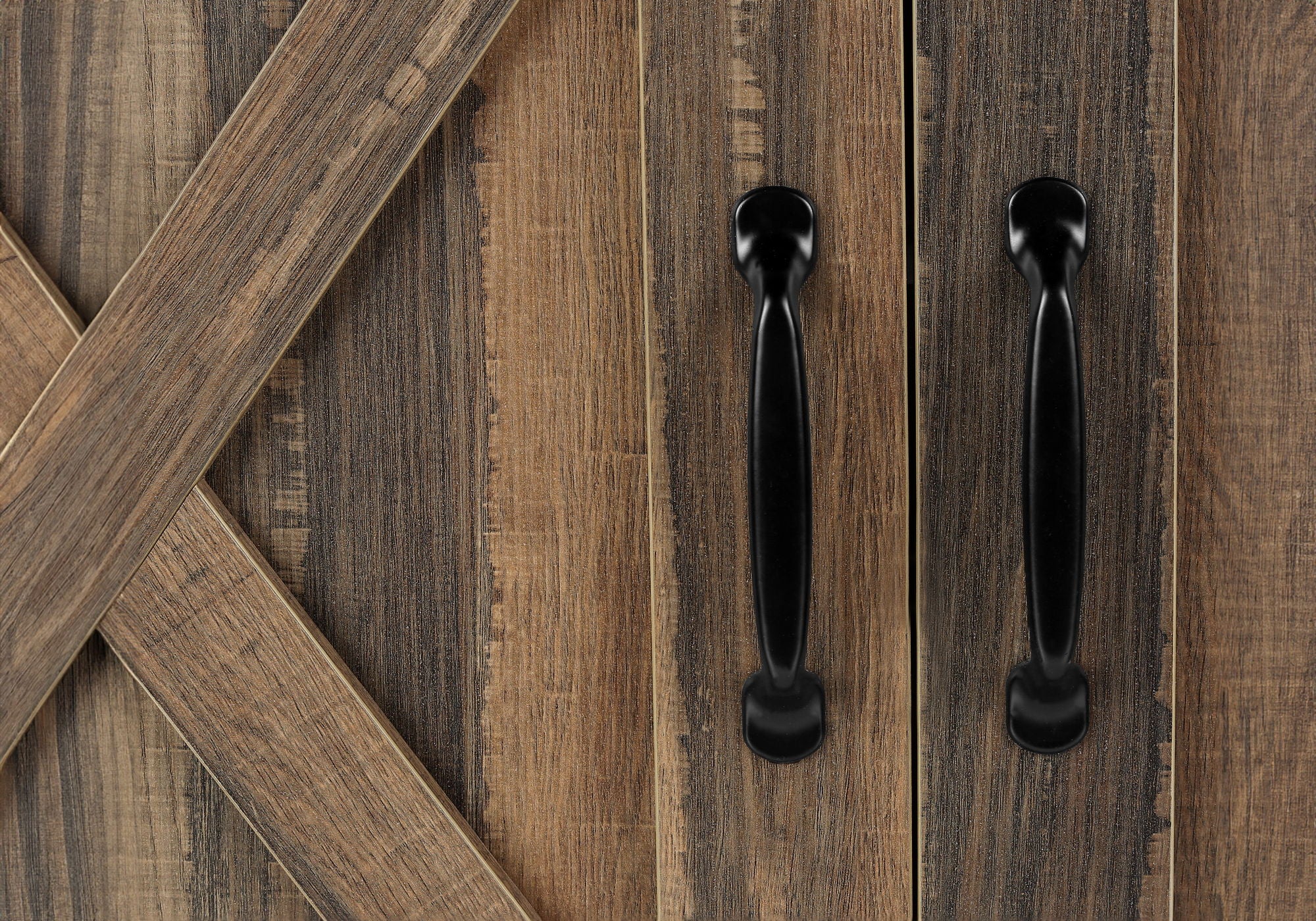• Sliding Doors: Equipped with two barn-style sliding doors that glide along a metal track, providing easy access and a rustic charm. The doors include metal handles for a cohesive look.