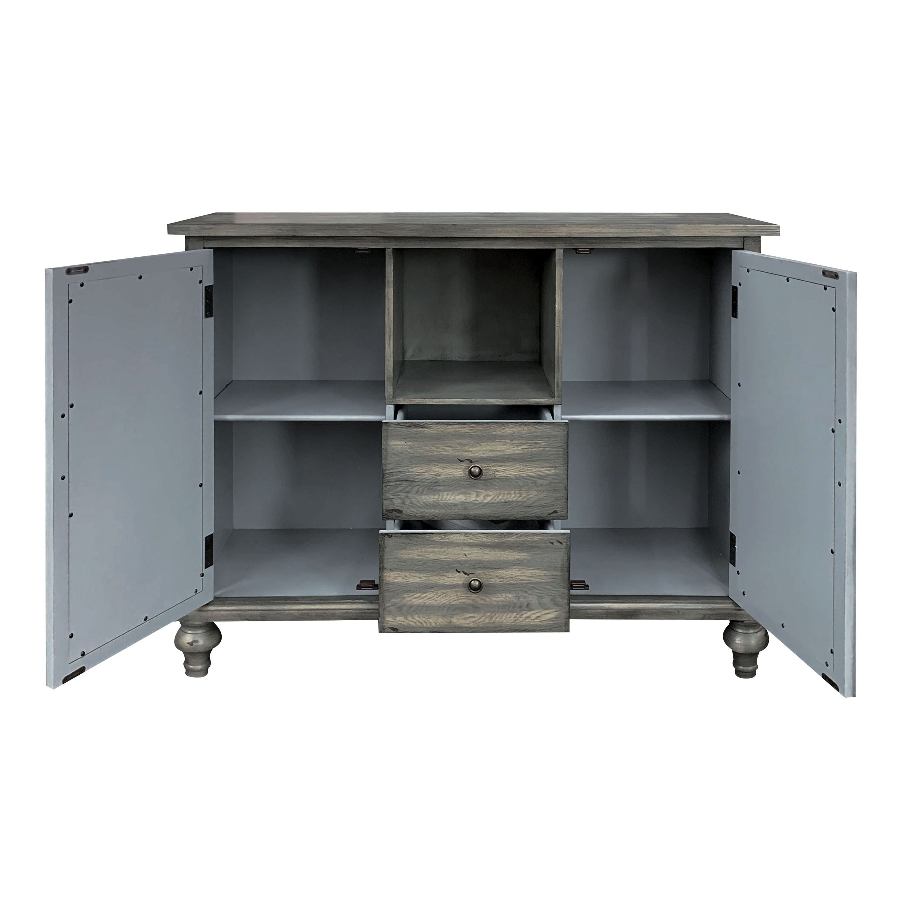 • Elegant Design: The Console Table features a weathered gray finish, blending rustic charm with modern elegance. Its mirrored door with diamond trim inlay and wooden bun turned legs add ornamental aesthetics and classic sophistication to any room.